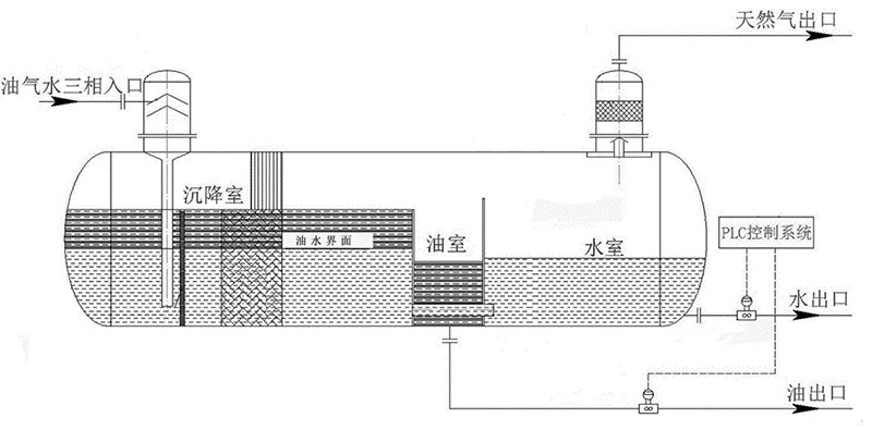 三相分離器由分離筒體、捕霧器、布液板、反射板、聚結(jié)填料、分程隔板、導水管、液位計、安全閥、液位控制閥等附件構(gòu)成,具有工藝簡單,投資少,便于管理和維護,指標穩(wěn)定可靠的特點,有利于實現(xiàn)原油處理工藝密閉。